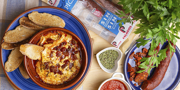Queso provolone fundido y Chorizo Picante Extra Palacios, ¿qué puede salir mal? Si eres amante de estos dos ingredientes, ésta puede convertirse en tu receta favorita. Además, como veréis a continuación, es extremadamente fácil de preparar. Ideal para compartir con tu pareja o amigos.